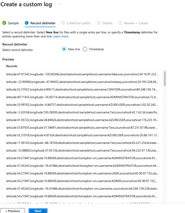 To store the collected geolocation data in Azure in a structured manner, I created a custom log within the Log Analytics Workspace where I had to upload a sample of the logs and give the exact path where to find the log file.