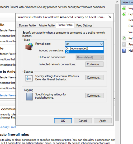Then I accessed the Windows Defender Firewall Settings from the Remote Desktop, and disabled the Firewall for Domain, Private and Public profile:
