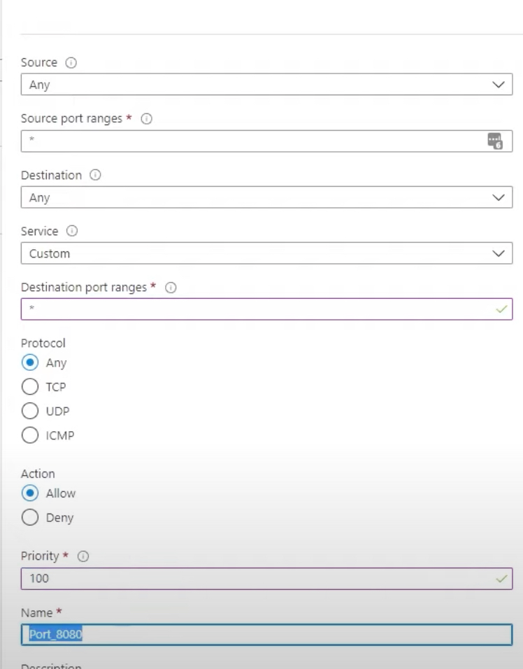 Under Network Security Group, I deleted the default firewall rules and created my own inbound rules which would allow all traffic. This involved intentionally making the VM vulnerable by turning off firewalls and allowing all traffic.