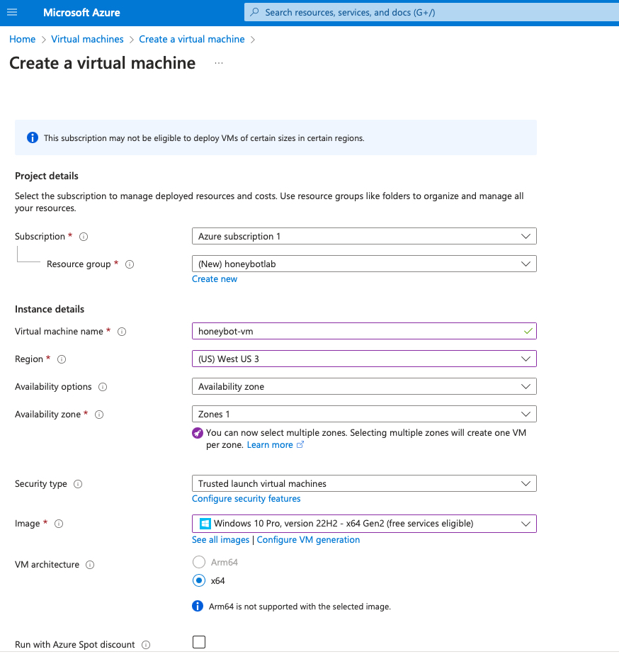 I created a resource group named “honeypotlab” and configured the honeypot on a virtual machine named “honeypot–vm.”